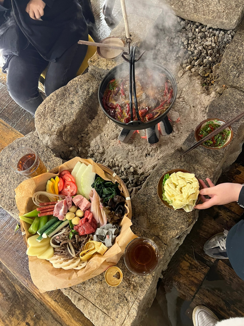 而火鍋的造型也相當酷炫,店家在每張桌子旁都架上了高高的樹木鞦韆,上面用繩子吊掛著火鍋的鍋子,下方也不是放瓦斯爐,而是用超原始的炭火加熱,真的讓人有種在戶外野營生火的感覺呢~