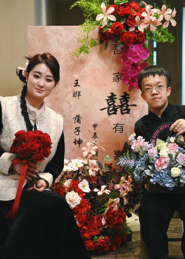 主持人請兩位新人上台,台下的賓客都在為他們歡呼。