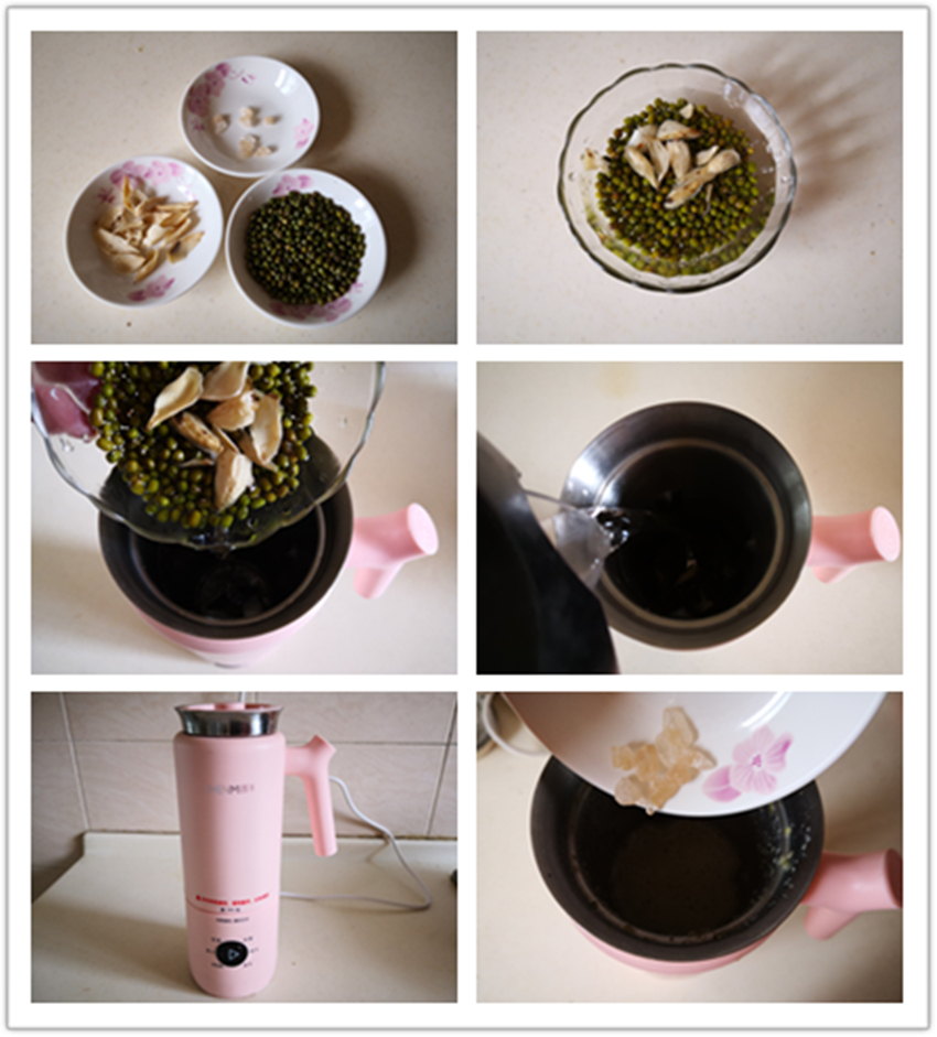 製作:1 準備好原材料; 2. 將百合和綠豆清洗乾淨; 3. 將洗凈的綠豆和百合放入臻米迷你破壁豆漿機中; 4. 按豆漿機刻度線加入適量的水; 5. 按下豆漿機製作米糊的功能鍵; 6. 時間到,「百合綠豆沙」就製作好了, 加入少許冰糖;