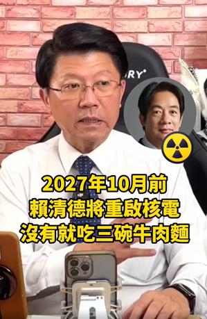 而去年5月17日,核三廠2號機正式停止運轉,台灣進入非核家園時代,然而不到12個月時間,能源政策出現大幅度轉向。謝龍介當時在直播節目中直言,若2027年10月之前,賴清德沒有恢復核能發電,他願意再吃三碗牛肉麵,更直指「太了解賴清德了,假裝沒那個意思」。他分析,假如核電廠能延役使用,國家就不必承受如此龐大虧損,光是拖延3年就會造成1兆8千億的損失。