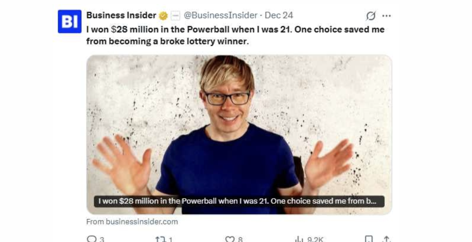但並不是所有事都那麼美好。舒爾茲無奈表示,中獎之後身旁的人總期待他請客、埋單,甚至有親戚直接伸手向他要錢,還理所當然認為這筆財富既然是天上掉下來的,就該跟大家一起分享。這些壓力讓他深刻體會,樂透得主並非只有光鮮亮麗的一面,也是他成為富翁後感到唯一的遺憾。