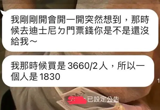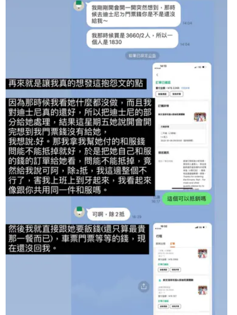 友人和曖昧對象去日本,主要是為了看奧運排球資格賽,機票和飯店都是AA,其他像是門票錢、車票錢、吃飯錢等,幾乎都是友人付的,加起來約一萬左右,本來沒想說要特別跟女方要錢,誰知道曖昧對象卻在今年1月突然跟他討迪士尼門票錢,一個人為1830元。