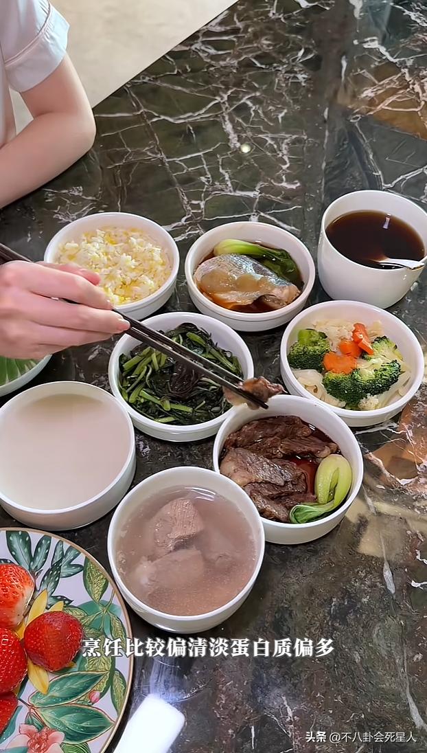 飲食上馬筱梅吃的也比較科學,魚肉、牛肉搭配花椰菜和其他綠葉菜,另外還有滋補的湯,整體上是以高蛋白和補充營養為主的。