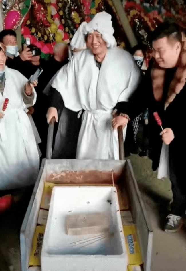 可能是因為小朋友比較多,亦或者「喜喪」的原因,戴玉強在弟子們演唱的時候,特地推著小車來回穿梭,上面則擺滿了糖葫蘆,逢小孩便送一支,面對鏡頭和小孩的歡悅,他也是喜笑顏開,離家多年,這次趕回,除了為母親舉辦葬禮之外,還要感謝村裡人對母親的照顧。
