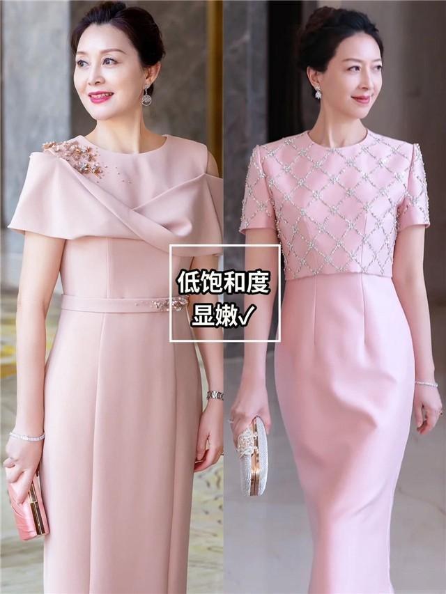 五十歲以上的女性要想穿出減齡的效果,可以多嘗試一下低飽和度的顏色。像圖上的低飽和度粉色系,低飽和度結合上低亮度的配置,不會對膚色產生過多的影響,同時又能襯托膚色,打造出顯白的效果,看上去很有名媛風的即視感。