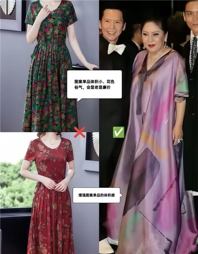 因此五十歲以上的女性一定要規避這類的色彩,若是實在喜歡拼接色的印花圖案,則要多嘗試大色塊的拼接色樣式,看起來會更加的簡約高級。