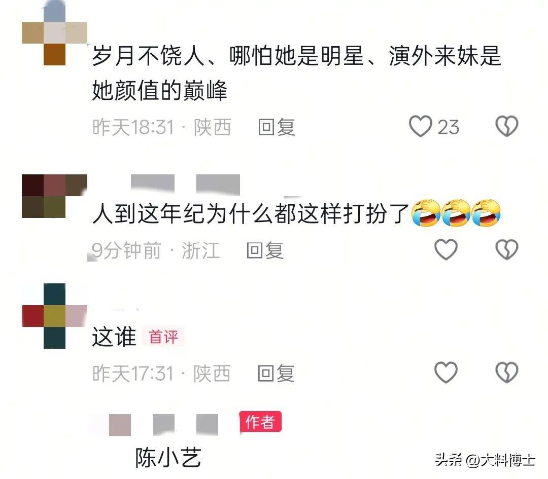 鏡頭拉近,可以看到陳小藝當天應該沒有化妝,臉上肌膚有些乾燥發黃,棒球帽沒有掩蓋住的頭髮已經有些花白,眼神相較年輕時也有些暗淡了,老態難掩。