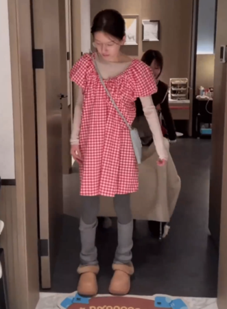 另一段畫面中,趙露思身穿紅色格紋連身裙搭配灰色褲襪,全身瘦到骨感明顯。她在朋友攙扶下,雖然腳步不穩走路仍搖搖晃晃,但她仍努力嘗試靠自己的力量走路,認真復健。這樣的景象與過去她活潑開朗、古靈精怪的形象形成強烈對比,令人不禁鼻酸。