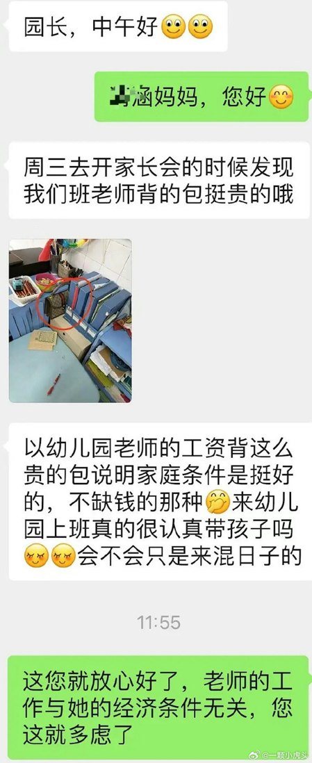 微博上日前瘋傳2張對話截圖,照片中可見某幼稚園家傳私訊給幼稚園長,表示前幾天開家長會時,發現有老師揹了名牌包(GUCCI)上班,她認為幼稚園老師的薪水應該不算優渥,能買得起名牌包的話,家庭背景或許很是優越,形容「不缺錢的那種」,所以擔心她可能不會全心投入教學工作中,「會不會只是來混日子的?」
