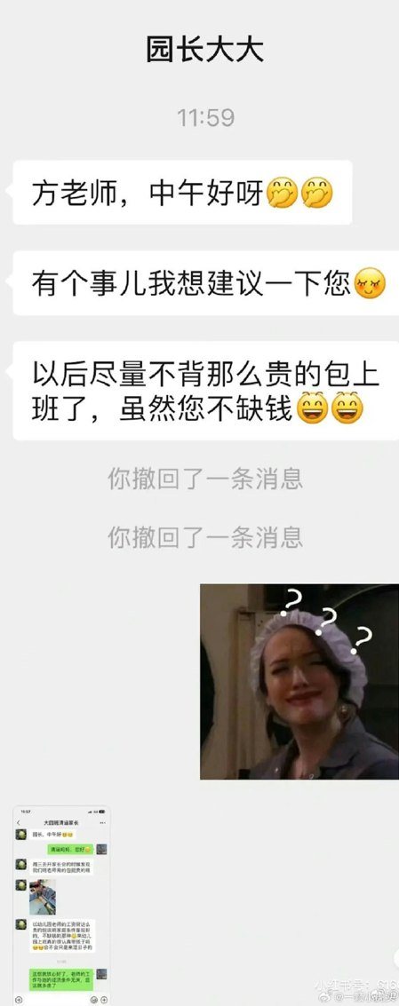 園長雖然當下跟家長保證:「老師的工作與她的經濟條件無關,您這就多慮了」,但回頭還是建議老師盡量不要背那麼貴的包上班,老師莫名其妙地傳出了問號的表情包,網友也紛紛傻眼表示:「管的真寬」,「她不會以為老師是她保母吧」、「別人揹什麼包跟工作有關係嗎?」、「回她:『貴嗎?這是我最便宜的包了』」更有同為家長的網友指出,相比之下更喜歡家境條件好的老師,「人家是真的超級喜歡人類幼崽所以才來上班,對孩子比別的老師都更有耐心,孩子們都很喜歡她」