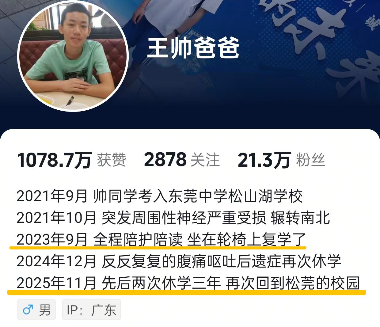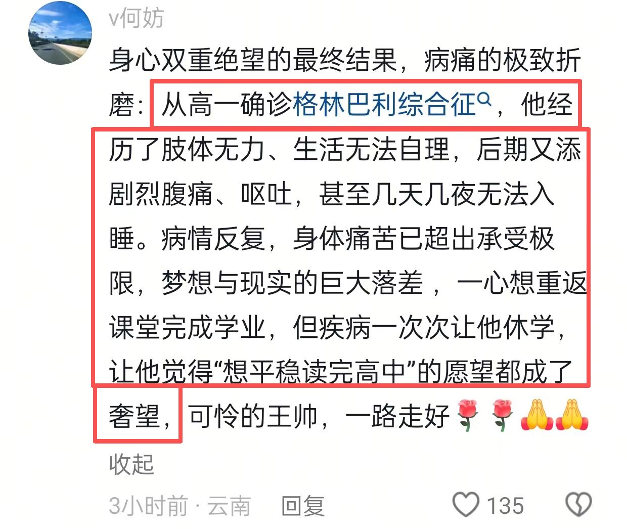 面對王帥的離開,網友們無法接受,但能理解,熟悉他情況的人都知道,這第四年,王帥經歷了肢體無力、生活無法自理、劇烈腹痛嘔吐,病情反覆,身體極度痛苦,原本學習是他的精神支柱,結果兩次輟學讓他意識到,或許自己完不成大學蒙了。