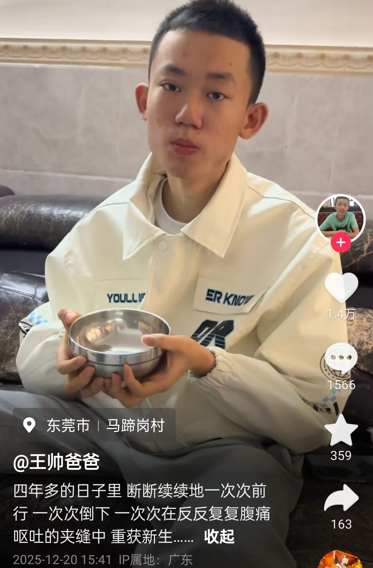 2025年11月,王帥重返校園,這一次,他已經能夠由父親攙扶著,站立行走,結果僅過了1個月,王帥再次被腹痛嘔吐折磨的不成樣子,直接住院治療。