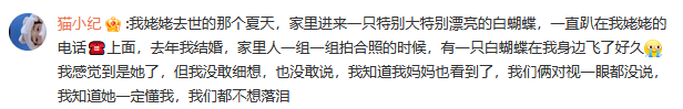 網友貓小紀說:姥姥去世後,有一隻蝴蝶在她身邊飛了很久,她能感覺到是姥姥,但是她沒有說出來也沒有哭。