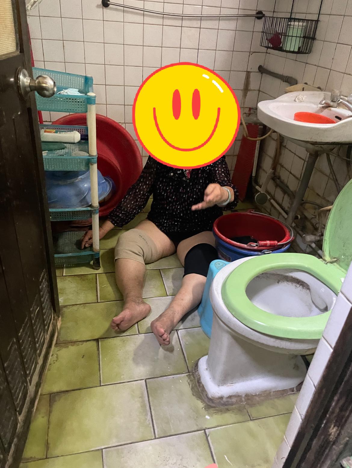 破窗進到屋裡之後,大家在浴室中找到了阿嬤,只見阿嬤倒臥於廁所地板上,褲子已經濕透,體力也非常差,精神上有些恍惚,看似已經累癱,基本表達都成問題,才讓眾人明白,看來阿嬤應該是獨自在家時不慎摔倒,在沒人攙扶的情況下無力站起來,才就這樣整整困在廁所兩天,所幸大家發現了她,才沒有造成更嚴重的後果。