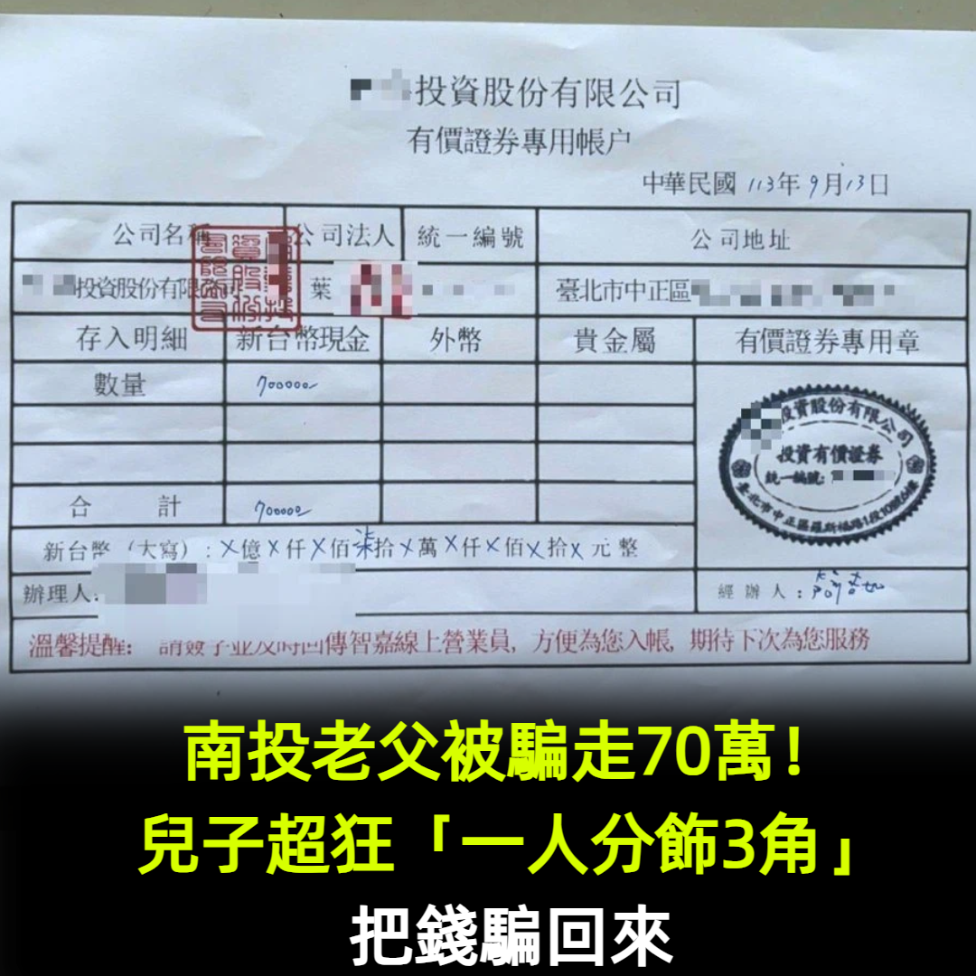 南投老父被騙走70萬!兒子超狂「一人分飾3角」把錢騙回來