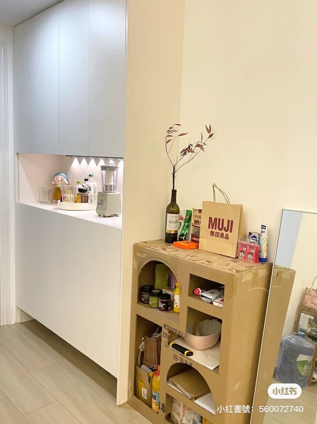最棒的是最後作者就把它放在家裡的某個小角落,各個平面大多都放一些小的、輕的物品,例如小飲品、果醬等,木頭色的樣子跟牆面相當融合呢~作者還很自豪地說「看我0元用紙箱改造置物櫃」。