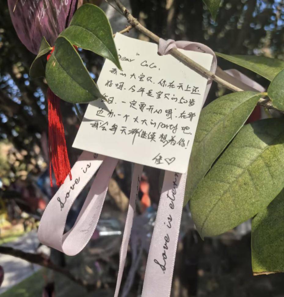 好多粉絲將祝福語寫在卡片系在樹上,這位粉絲寫著「我的大寶貝,你在天上還好嗎?今年是寶貝的50歲生日,一定要開心哦,在那邊辦一個大大的party吧,我會每天都繼續想著你。」
