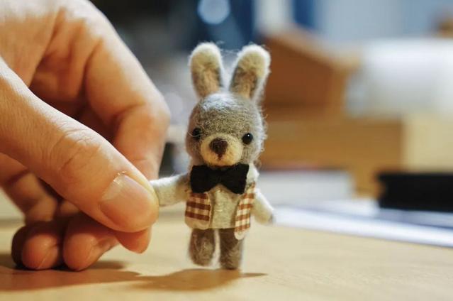 殷越的第一個羊毛氈作品是「領結兔子」,「我先畫了一個草圖,然後配置羊毛的顏色,花了大概一個下午的時間,做了一隻小兔子。做完之後特別有成就感,迫不及待地給它做了小房子、拍了照片,放到網路上,收到不錯的反饋。」