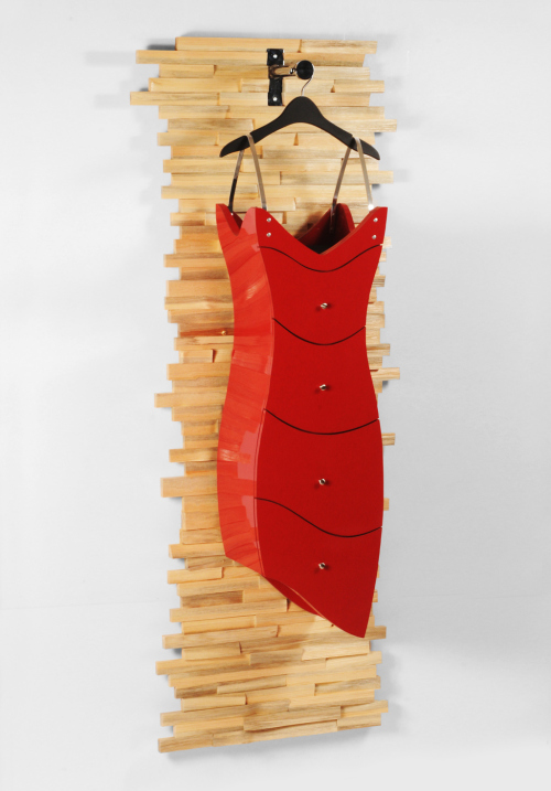 性感的小紅禮服吊在衣架上,但你可不要以為這能穿唷!我可是可以讓你穿載各種物品的櫃子呢~
