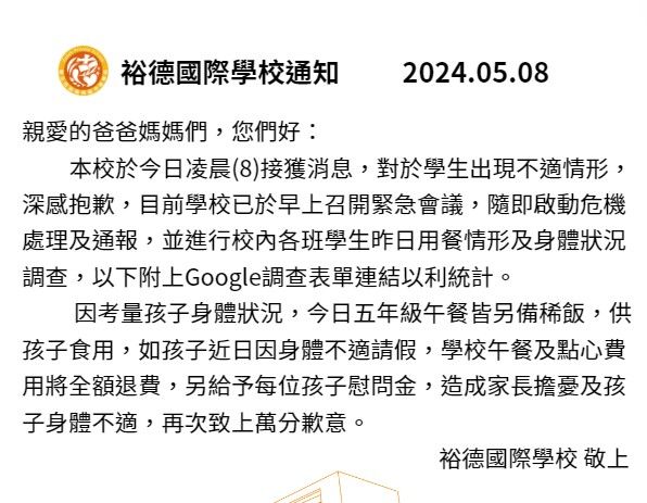 新北私立裕德國際學校先前舉行小學五年級「校外食農教育活動」,一共有250多名學生、10幾名老師參與,並前往台中新社農會參訪。不過,事發當晚卻傳出150多名學生、5名教師出現上吐下瀉的狀況,其中有4名學生發燒住院,疑似是食物中毒。後續,校方已通報教育局校安中心,校長李慶宗也出面說明了。