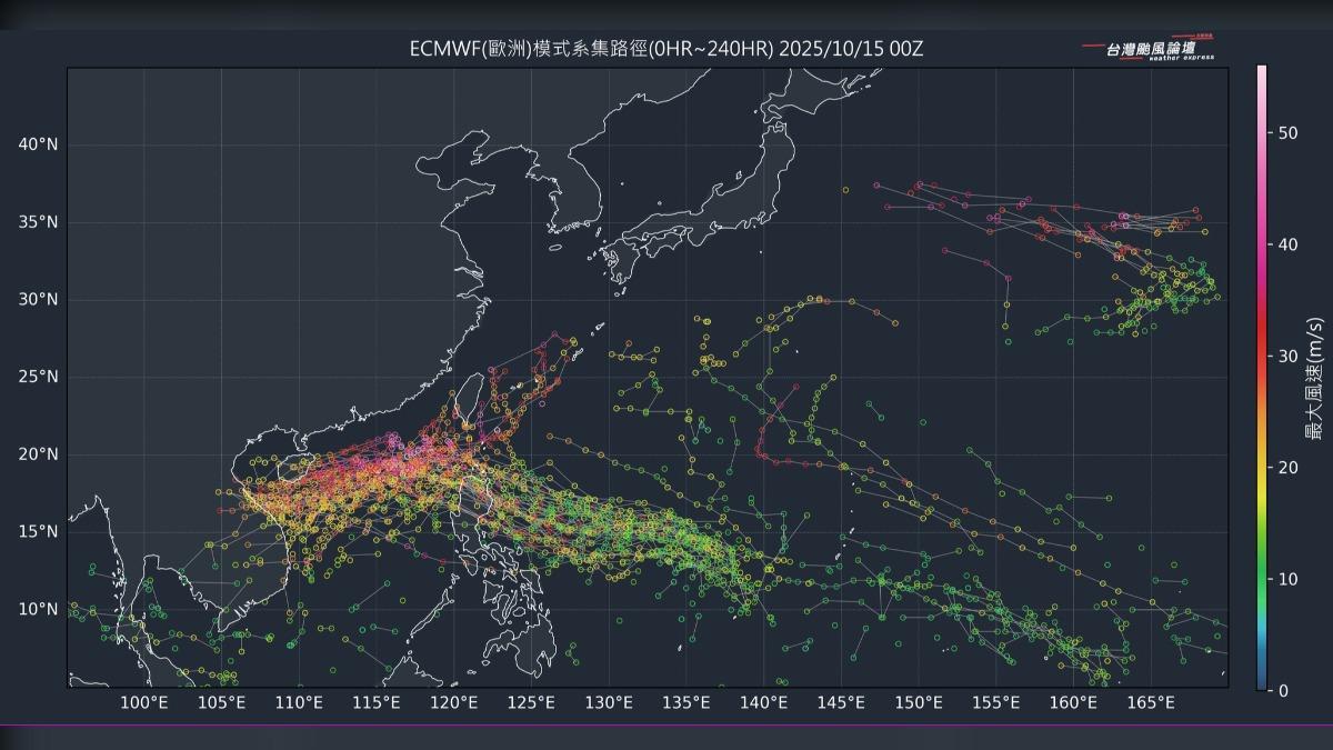 知名氣象粉專「台灣颱風論壇|天氣特急」分析最新歐洲模式系集圖指出,「風神」颱風最可能的路徑是直接襲擊菲律賓呂宋島。這個預測結果也獲得Google AI (FNV3)模式的支持,不過由於秋季颱風的路徑常有變化,在風神抵達前仍有調整的空間。