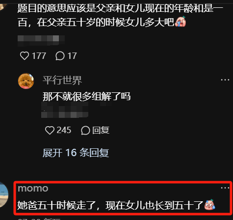 有人說出題老師的意思可能是這個父親不止有一個女兒,比如有兩個女兒的話,那麼分別是二十五歲,父親50歲就非常合理了。還有人說題目的意思應該是父親和女兒現在的年齡加起來是100歲,問的是在父親50歲的時候,女兒多大?