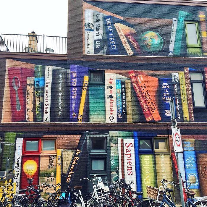 簡表示3D街頭藝術概念的其中一部分,就是讓居民也參與藝術過程,他一一拜訪附近的民眾,得到了許多有趣的意見,牆上的書主題不一,只有特別避開容易引起爭執的政治和宗教相關書籍,有些人喜歡小說、有些人熱愛詩集,甚至還有小朋友推薦的繪本!這個書架集結了不同的文化,書本的語言總共有八種語言之多!