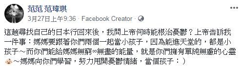 范瑋琪幾年前在臉書上寫下「我問上帝何時能根治憂鬱?上帝告訴我一件事:媽媽要跟著你們兩個一起當小孩,因為能進天堂的,都是小孩子~媽媽向你們學習,努力甩開憂鬱情緒,當個小孩:)~ 」,據悉是范瑋琪到日本旅遊,尋找自我的路途上她與自己的內心聊聊,有感而發才寫下這些話,讓不少粉絲看到了范瑋琪的另一面,紛紛留言替她加油。
