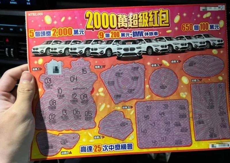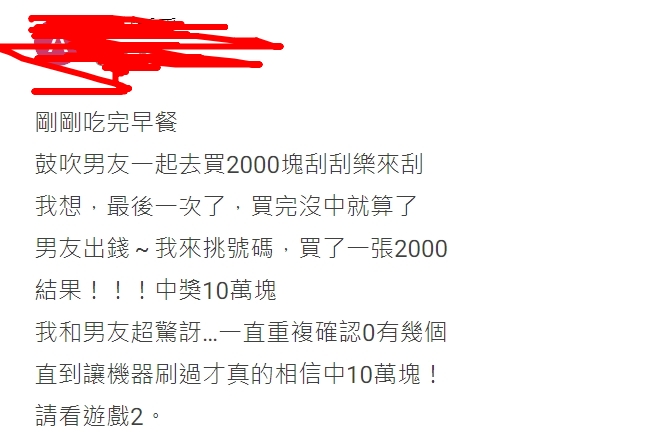 據《TVBS》報導,這名女網友在社群平台上分享,自己原本手氣不是很好,但是後來買了幾張彩券後,卻直接賺到6100元的獎金,賺了5000多元讓她覺得,運勢正要旺起來了,就決定挑戰一下2000元的刮刮樂,沒想到一刮下去,竟然馬上中10萬元,讓她忍不住驚呼:「一直重複確認0有幾個,直到讓機器刷過才真的相信中10萬塊!」