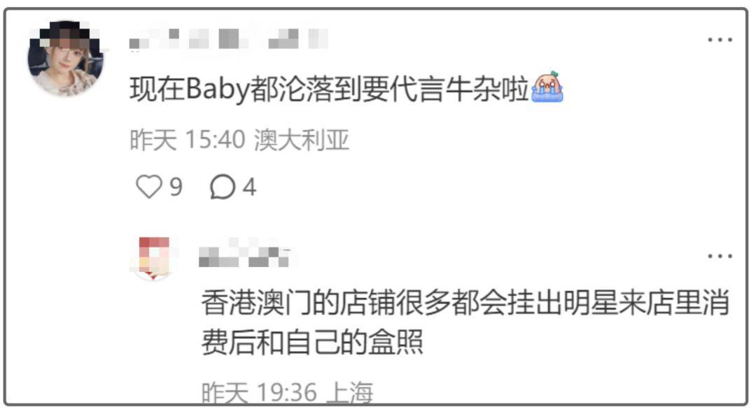看到這有網友覺得唏噓不已,現在楊穎都淪落到為牛雜代言了。即便是有很多港澳的小吃店都會曬出明星打卡代言的照片,但反過來看baby為牛雜站街這件事,還是覺得怪怪的。