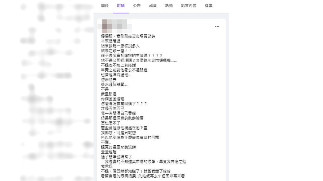 此外,他還加碼爆料,提到曾和對方在地下室獨處過、還壁咚過人家,有過想越界的念頭,但也只是想想而已。而針對他酸對方「淪為賣菜姨」的言論,卻意外釣出眾多知情網友解答,紛紛笑他:「不識貨!別瞧不起市場擺攤的!」