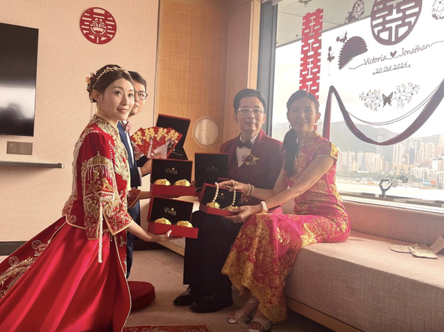 按照傳統,新人一早就出門,向麥翠嫻夫婦敬茶。麥翠嫻在上午儀式的時候,穿了一條桃紅色金線繡花旗袍,非常應景,還佩戴了一套翡翠首飾與珍珠手鏈。在接受敬茶之後,麥翠嫻送上三對巨型流星錘龍鳳鐲,以及珍珠手鏈外加一個大紅包給女兒、女婿,這也算是門面上的嫁妝了。