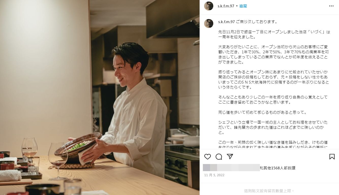他在累積實績與人氣之後,於3年前在銀座開設高級日料店「IZUKU」,成為政界、財經界、上流貴族最喜歡造訪的餐廳之一。也因為顧客來頭不小,該店套餐訂價極高,為3.5萬日幣(約新台幣8229元),加上飲料最低消費就要5萬日幣(約新台幣1萬1755元)。因為他的帥氣外貌,令不少名流為他傾心,甚至不惜買下高價的酒,只為吸引他的注意。此外,他還開設IG、YouTube頻道,立刻就吸引超過萬名粉絲追蹤,可說是非常受歡迎。