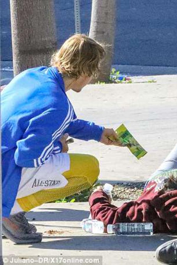 小賈斯汀不確定流浪漢是睡著了還怎樣,輕輕拍了對方一下,對方醒來後他感到放心,接著還拿出皮夾掏出一些現金給這位街友、要他去買些食物來吃,接著便直接離去。