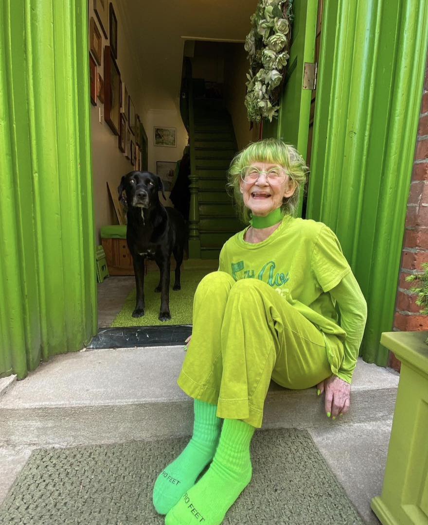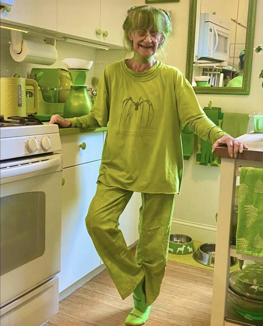 根據The New York Times報導,這位綠色奶奶的工作室是一位製作迷你高級水彩顏料的藝術家,自從50幾歲開始就有這一身的打扮,而她喜愛綠色的程度勝過於一般人的想像,即便是一般人看不到的內衣都堅持要穿上綠色,還會自己買不同顏色的衣物回家將它染成綠色。有時候甚至一度瘋到要把當時養的黃金獵犬Dylan也染上綠色,但後來被自己的兒子制止後才沒有這麼做。