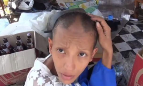 照片中的她頭髮剃光、皮膚、身上裹著一塊布,穿著拖鞋坐在路邊啃手指。但哪怕是這樣頹廢潦倒的模樣,也能看出她的五官、臉型和皮膚都是美人的底子。