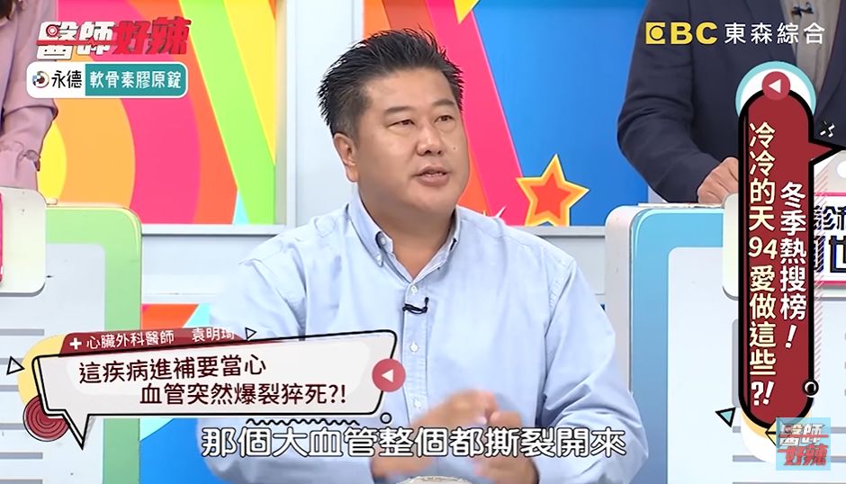醫生更說他的「心臟大血管整個撕裂開」,診斷為主動脈剝離,經歷10幾個小時的手術,最後還是沒把人救回來,袁明琦更呼籲民眾「天氣一冷血管會收縮,當喝了熱湯、酒類血管又放鬆,一放鬆、血往下沉,你到腦部的血液本來就不夠」,這時若又跑到戶外驟冷環境血管一下子又縮起來,一上一縮,又上不去,就會立刻倒地,是非常危險的事情。」。