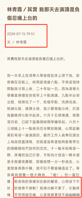 原來林青霞在清華大學畢業典禮的前一天,不慎從床上滾落,撞斷了2條肋骨,但為了不失信,以及不麻煩別人,她堅持忍痛上台演講了。