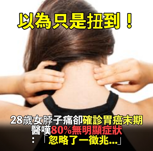 28歲女「脖子痛一週」以為扭到! 一檢查「竟是胃癌末期」醫嘆:80%早期無明顯症狀