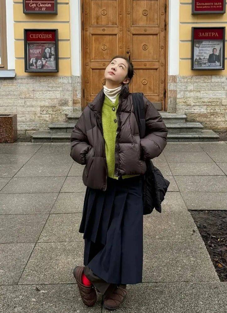 白色高領打底疊穿彩色內搭,總能讓暗沉的秋冬外套看起來多一份清爽,看著會更年輕乾淨一些。