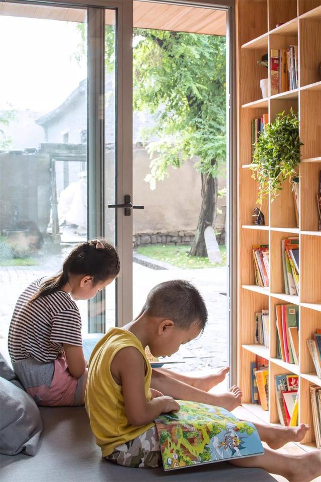 ▼小院子裡,還加入了一個小小的閱覽室設計,裡面擺放了書架和小書房,讓家裡的小孩有了閱讀、玩耍和做作業的空間。