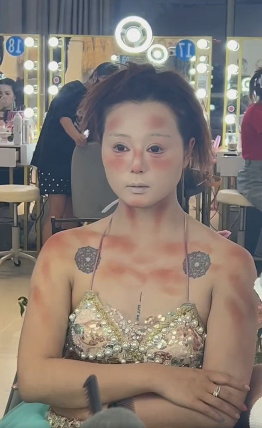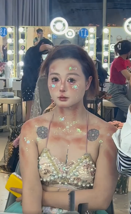 不過接下來化妝師拿出亮片一一點綴在臉上和身上,看起來似乎比較好一些了?