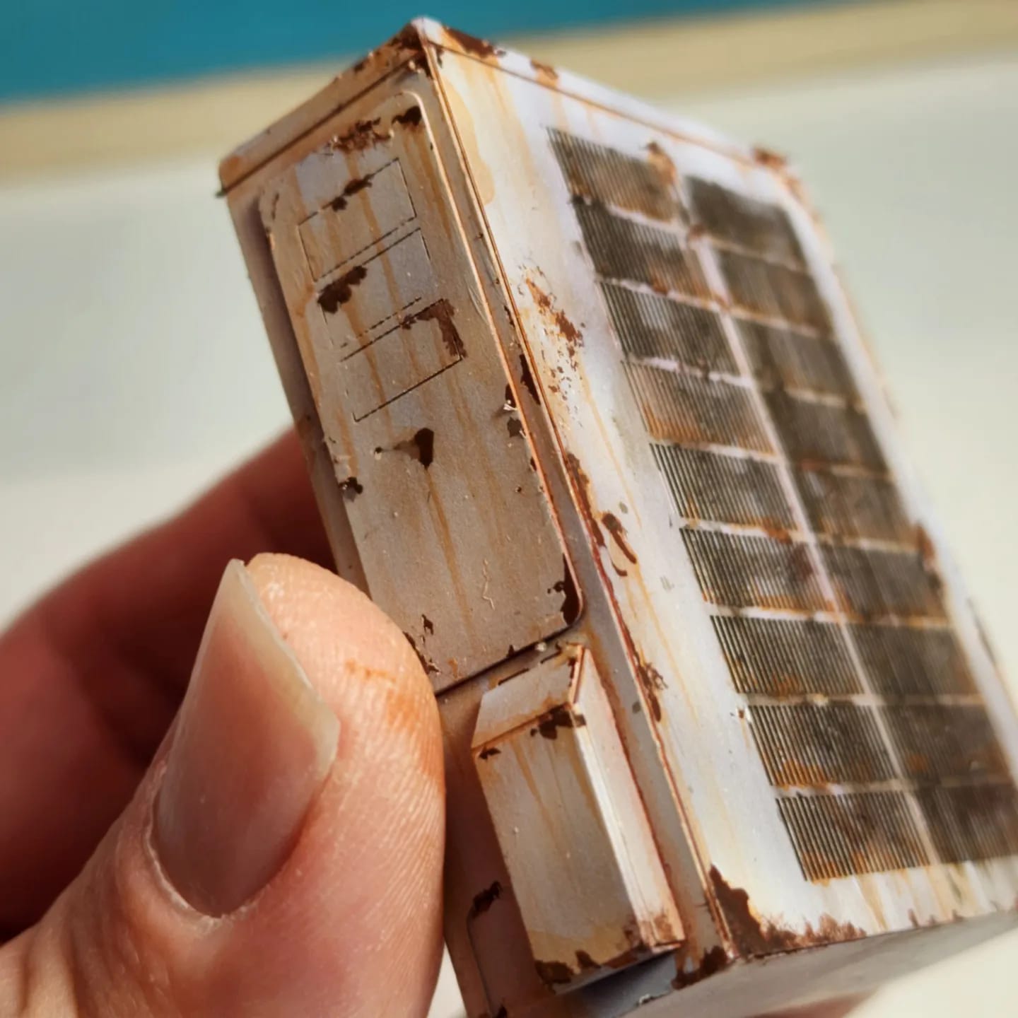 可以看到照片中,巧手爸手作的「做舊冷氣室外機」,除了有著跟真實一樣的外表以外,那般斑駁又生銹的模樣,簡直就像是真實生活中會遇到的機器,特別是原PO還大聲說:「是馨寶冷氣全變煩,不是聲寶冷氣全變頻喔!」在仿照模型之外還超幽默。
