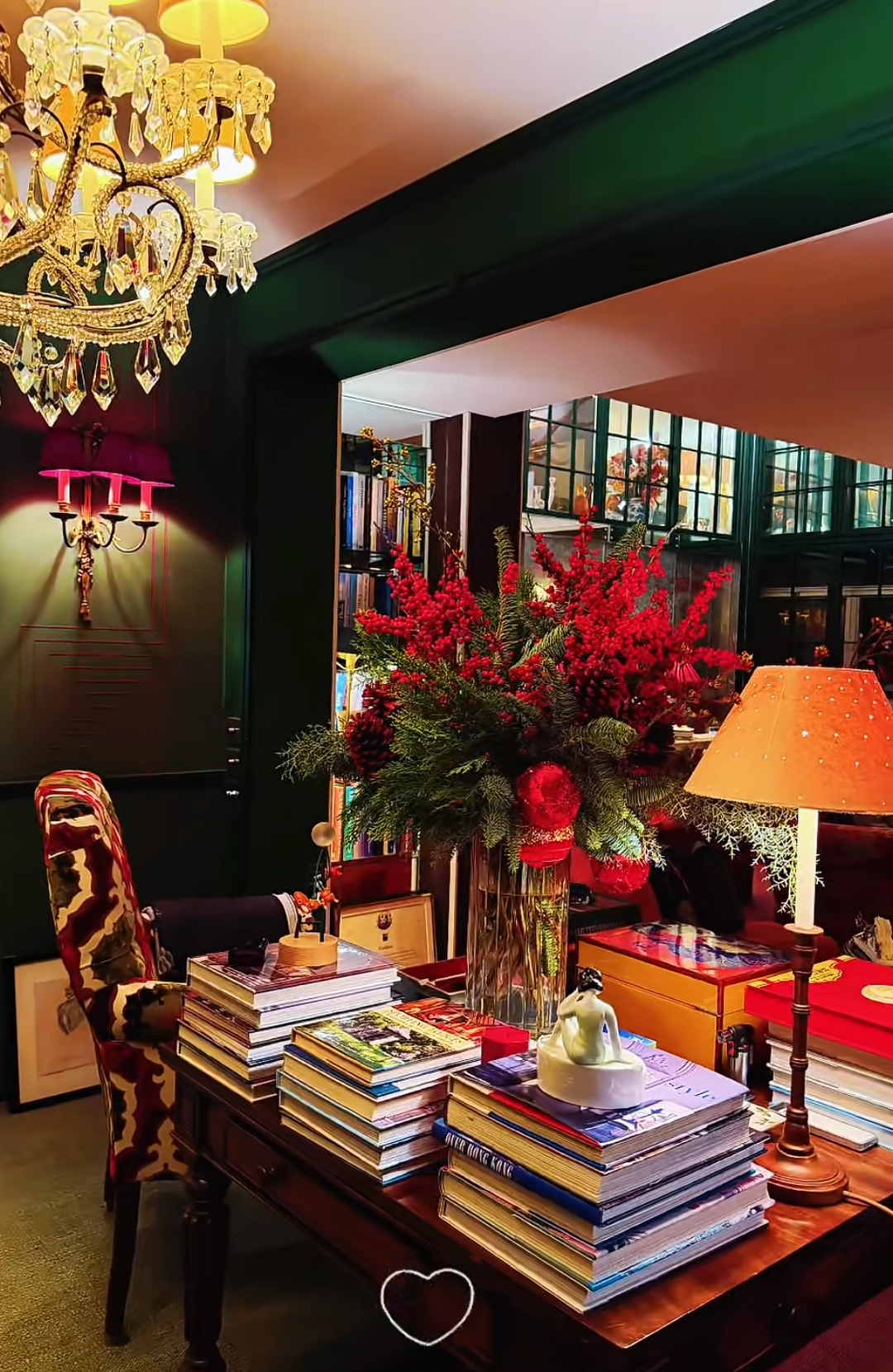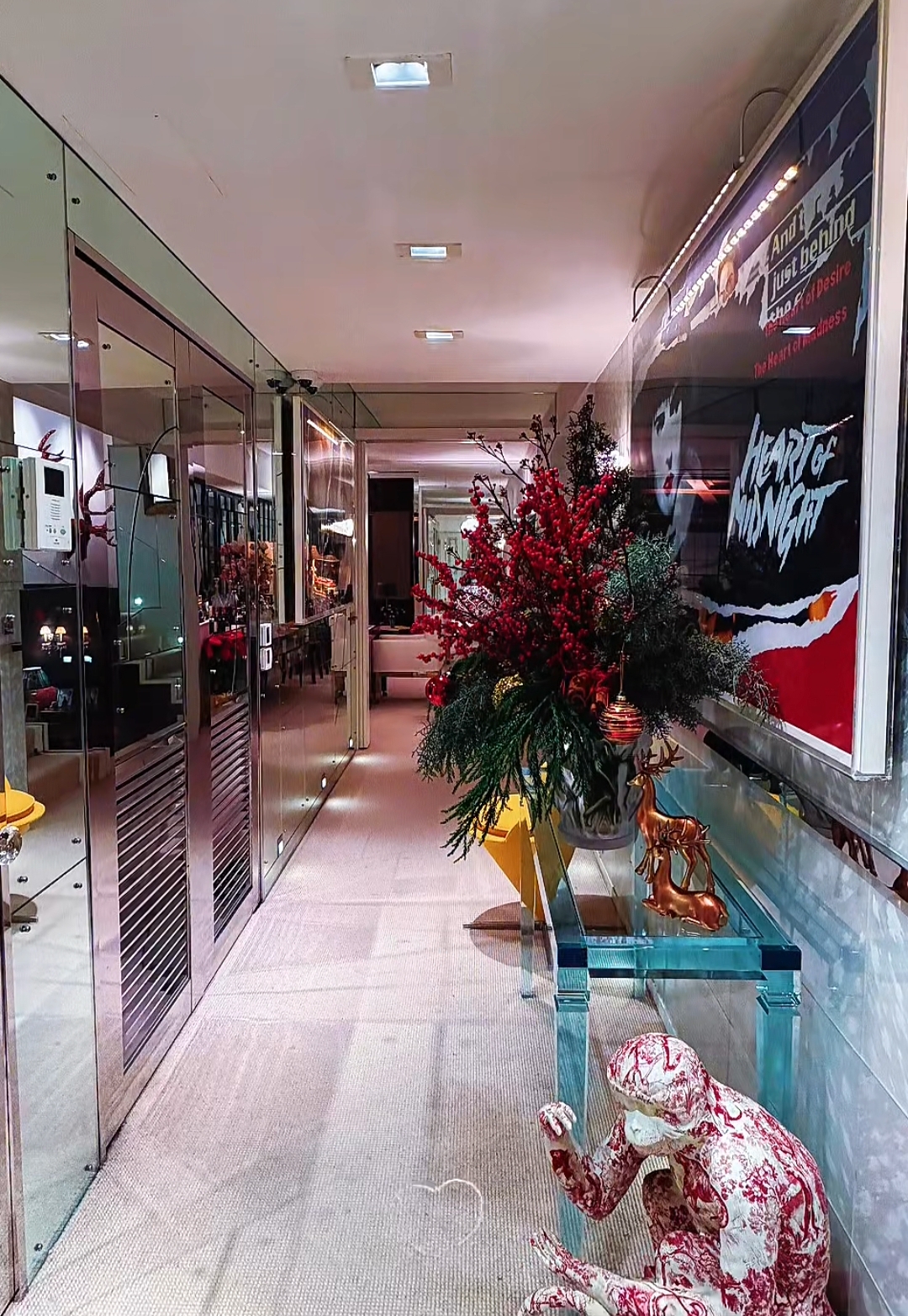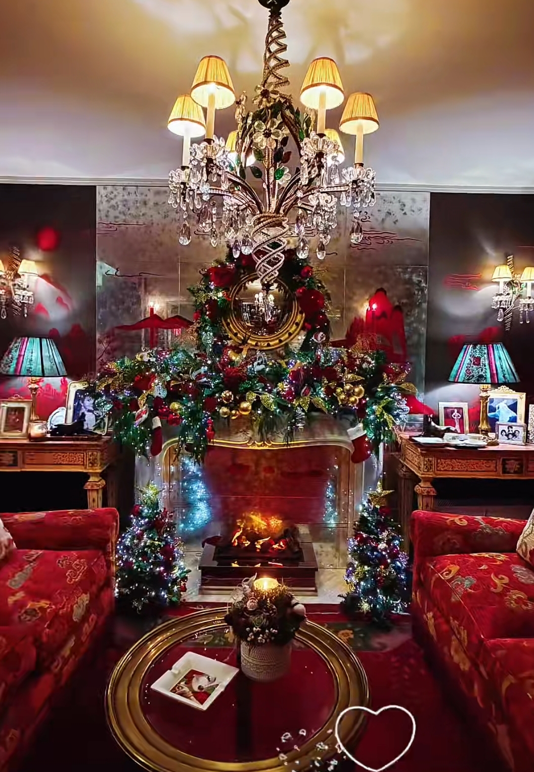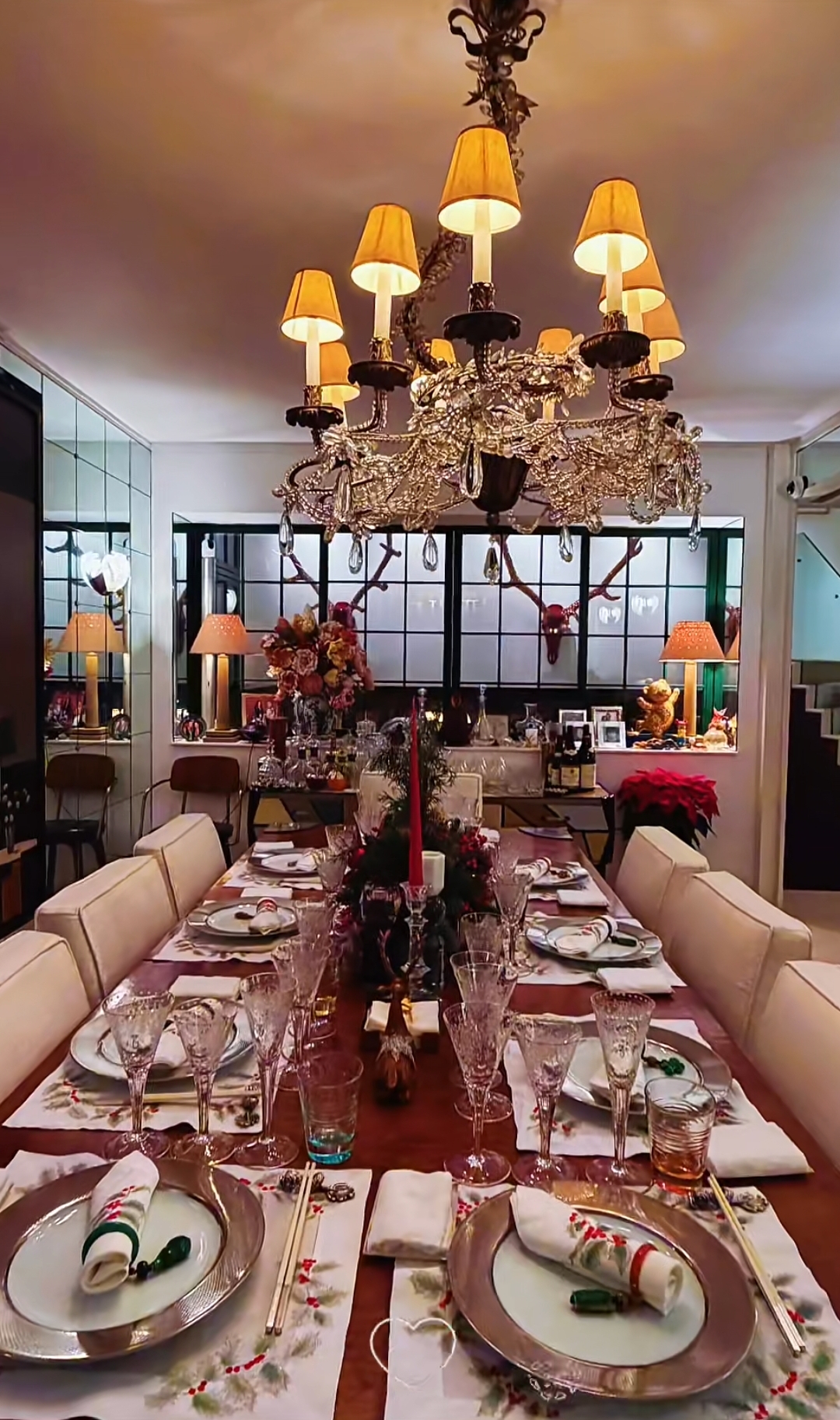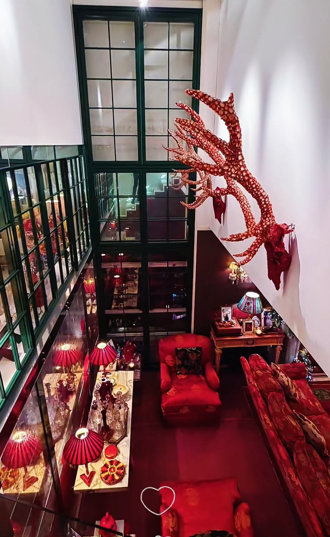 豪宅內處處散發著節慶的氣息,而每個角落不時會擺放著價格不斐的古董。例如牆壁上的這對鑲了紅寶石的鹿角,價格估計沒有7位數根本拿不下來。