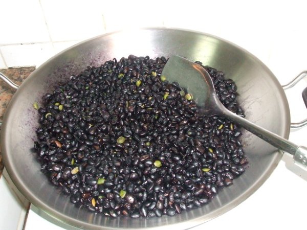 1、把洗淨晾乾的黑豆放入炒鍋中中火乾炒。