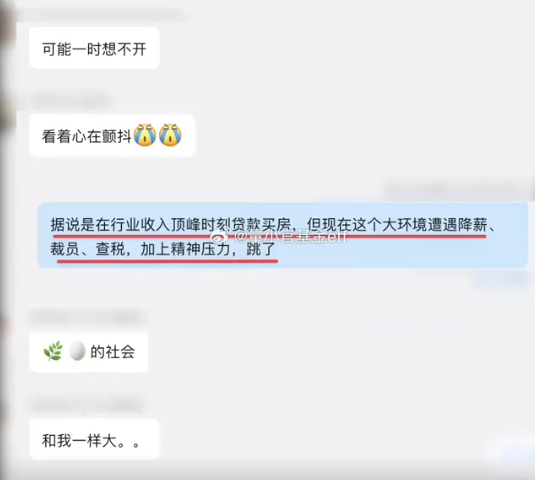 網路謠傳,女子是因為公司突然降薪,再加上房貸壓力與日俱增,才選擇結束生命。但《新黃河》報導稱,中金公司人士先是證實死者為該分公司員工,「她是因為自身原因離世的,不是跳樓。公司已經在第一時間成立了專項小組幫助善後」,表明對此突發憾事感到悲痛,也向家屬、親友表達不捨之情,對網上的言論則全盤否認,「對於網傳我司員工跳樓謠言,希望大家尊重逝者隱私,不信謠、不傳謠」。