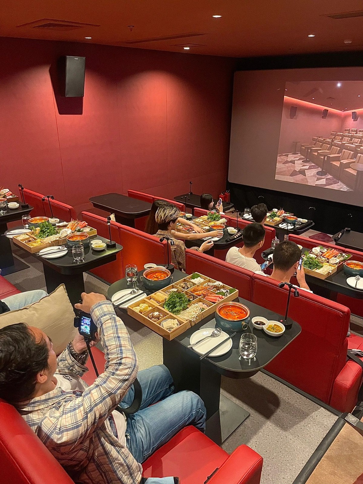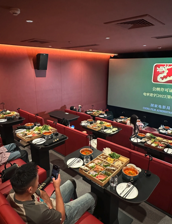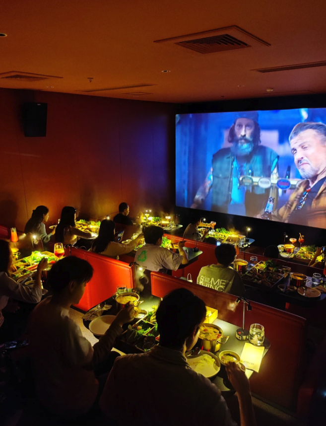 這間影廳裡的座位都是雙人沙發,面前則放了小餐桌,影院透過高低差來增加觀影體驗,空間也十分寬敞,非常適合情侶或好友一同前往~購買「火鍋套票」的觀眾可以拿到「兩盤九宮格菜盤」,包括新鮮的海鮮、肉品以及經典的丸類等等全都能一次享用!