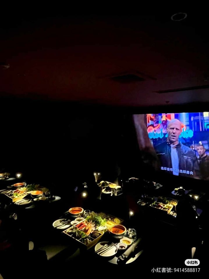 雖然看電影時大都是一片漆黑,但為了讓觀眾可以看見吃鍋的食材、不會被熱湯燙到,影院也貼心在座位額外打上一盞燈,呈現「又暗又亮」的超神奇景觀,遠遠看去格外有浪漫氣氛,超級適合約會的呀~