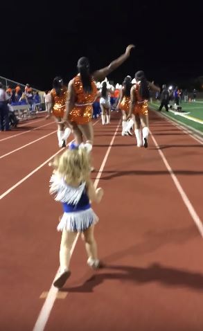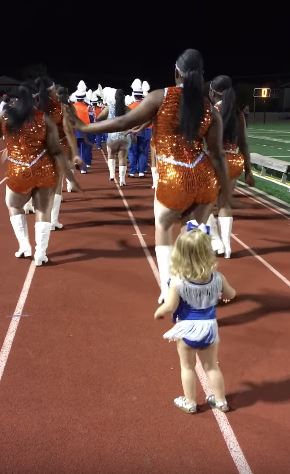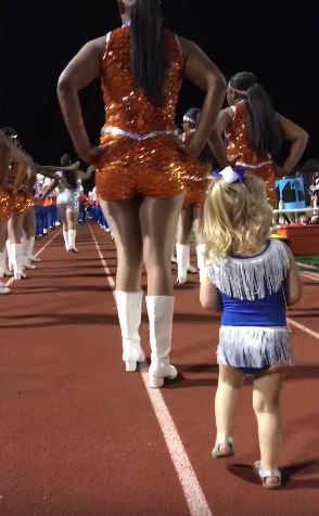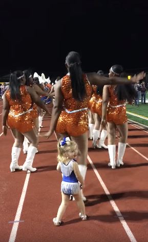 2017年時網路上就瘋傳這段可愛影片,畫面中這位2歲小女娃歐莉(Ollie Malone)身穿藍色流蘇上衣、小短裙和白色涼鞋,頭戴可愛的藍色蝴蝶結,一身勁裝的她跟在眼前這一群啦啦隊大姊姊後面,成為全場最吸睛的焦點!